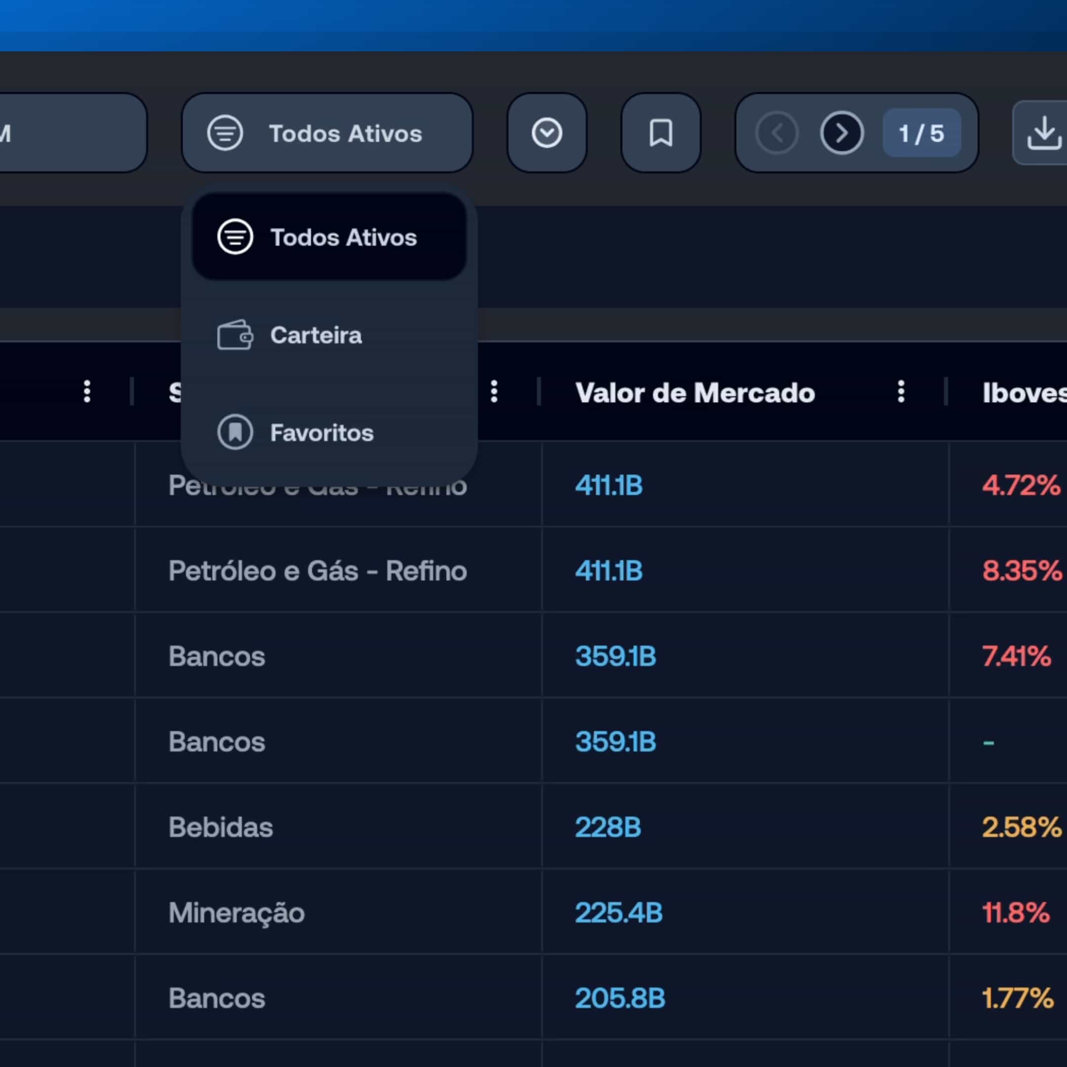 Carteira, favoritos ou todos os ativos